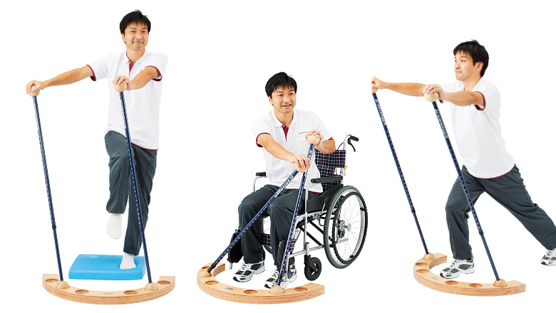 木製のベースと2本のファンクションバーを用い、日常生活やスポーツのような場面をシュミレーションし、高齢者に必要な運動要素をトータルにバランスよくトレーニングできます。